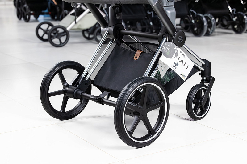 Безопасность вашего малыша обеспечивается пятиточечным ремнем безопасности и регулируемой подножкой с тремя положениями. Каркас коляски выполнен из высококачественного и прочного, но легкого алюминия, обеспечивая стабильность и прочность. Благодаря небольшой ширине шасси, коляска легко проходит через любые дверные проемы и помещается в лифт. Кроме того, шасси компактно складывается и имеет двухколесный режим, что позволяет преодолевать препятствия с легкостью. Передние колеса поворачиваются на 360 градусов, придавая коляске Priam невероятную маневренность. Сайбекс Приам 4 имеет очень большую корзину для покупок, выдерживающий вес до 5 кг. Вместительная корзина для покупок раскладывается, когда вам нужно больше места во время поездки или похода по магазинам.