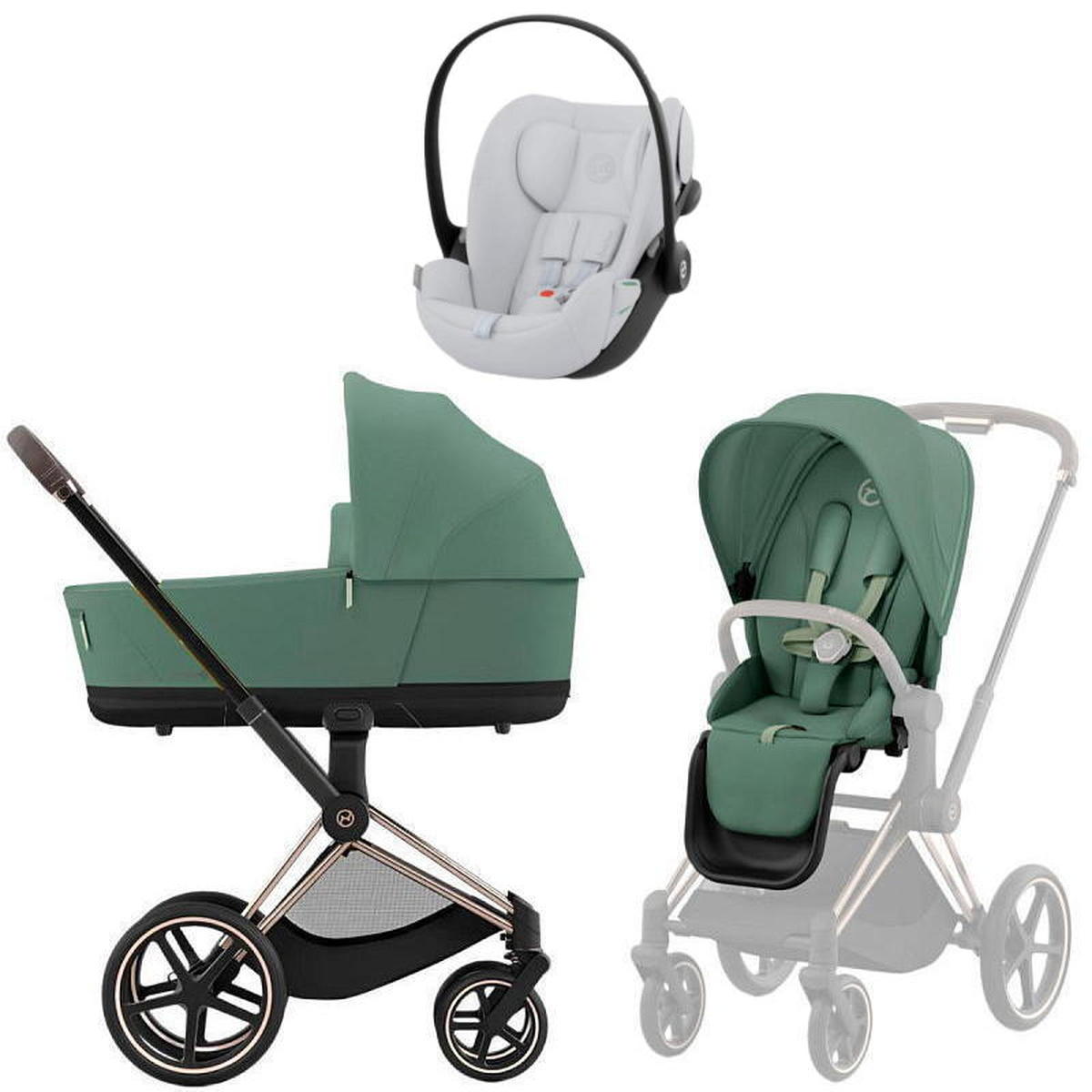 Коляска Cybex Priam IV Rosegold complete и автокресло Cloud G i-Size Fog Grey 3 в 1 Leaf Green
