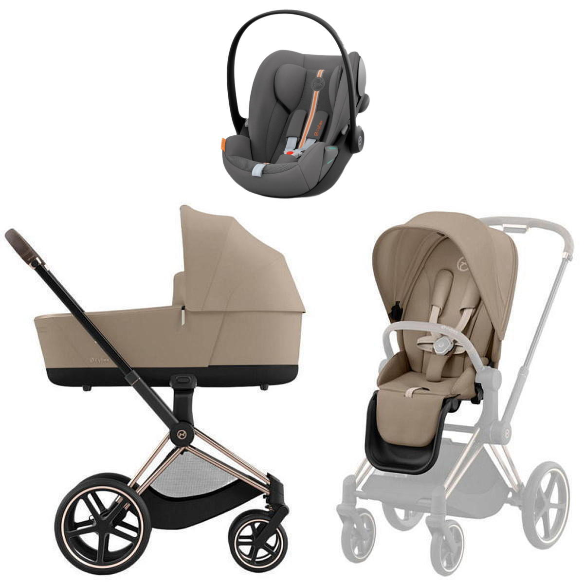 Коляска Cybex Priam IV Rosegold complete и автокресло Cloud G i-Size Lava Grey Plus 3 в 1 Cozy Beige