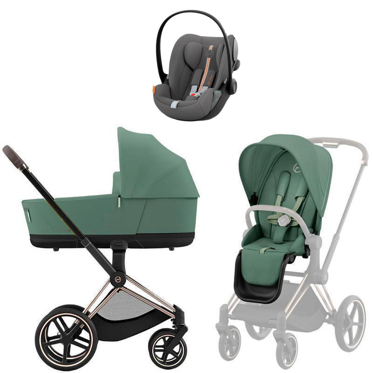 Коляска Cybex Priam IV Rosegold complete и автокресло Cloud G i-Size Lava Grey Plus 3 в 1 Leaf Green