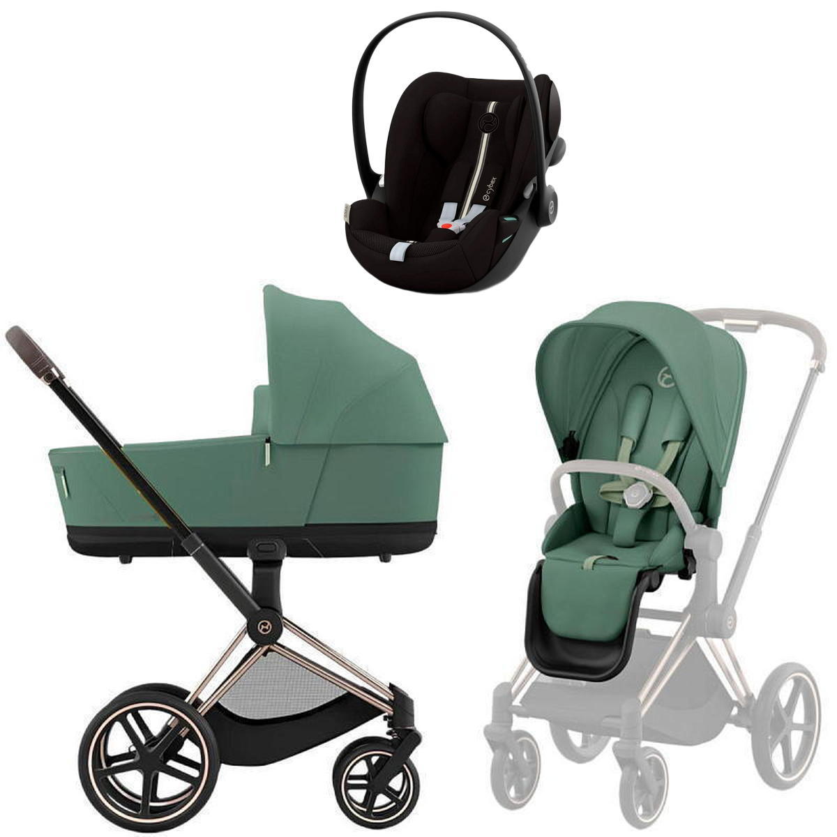 Коляска Cybex Priam IV Rosegold complete и автокресло Cloud G i-Size Moon Black Plus 3 в 1 Leaf Green