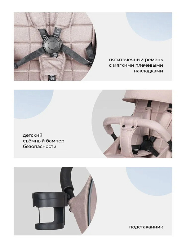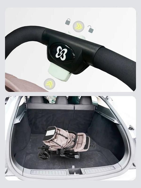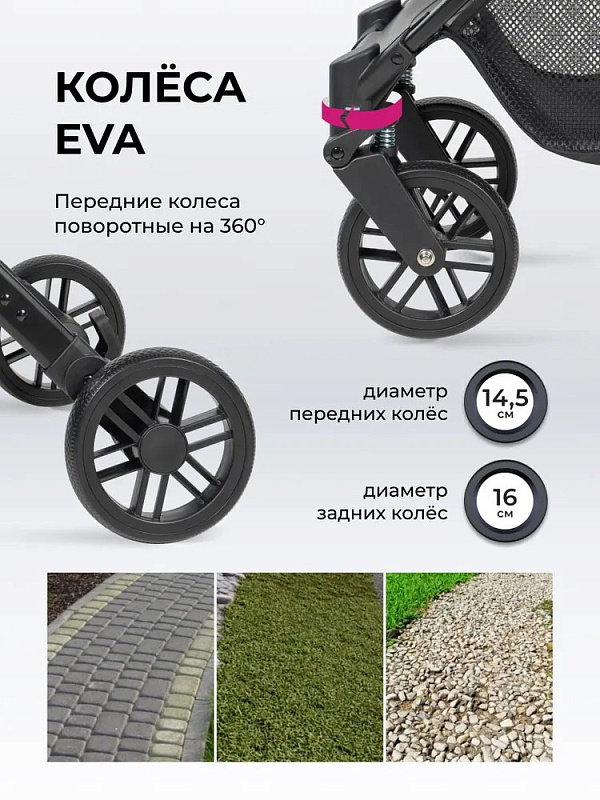 В сложенном состоянии прогулочная коляска стоит вертикально. Колеса с протектором изготовлены из материала EVA. Передние колеса вращаются на 360, что улучшает управляемость.
