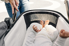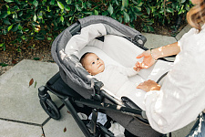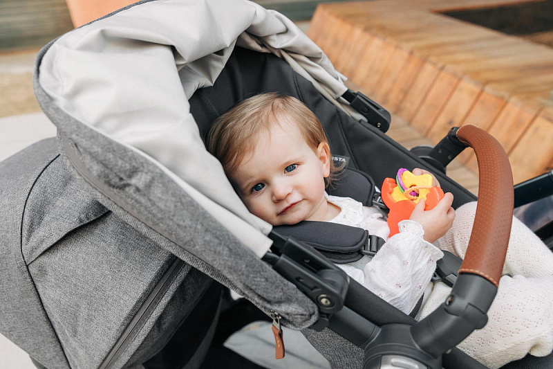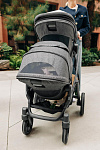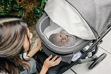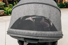 Капор прогулочного сиденья оснащен дополнительной секцией на молнии, а смотровые окошки с москитными сетками позволяют наблюдать за ребенком во время прогулки и создают в коляске комфортный микроклимат.