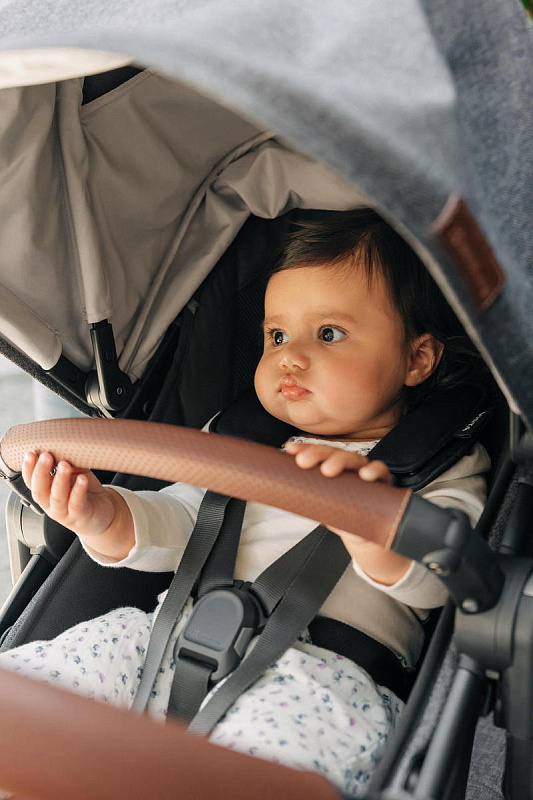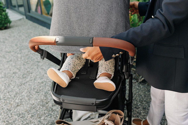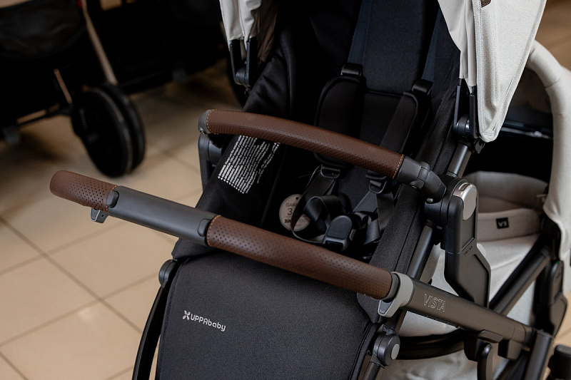 Ручка регулируется по высоте для удобства использования родителями любого роста. Накладка на ручку выполнена из высококачественной натуральной кожи, поэтому обеспечивает надежный хват и легкий уход.