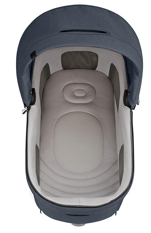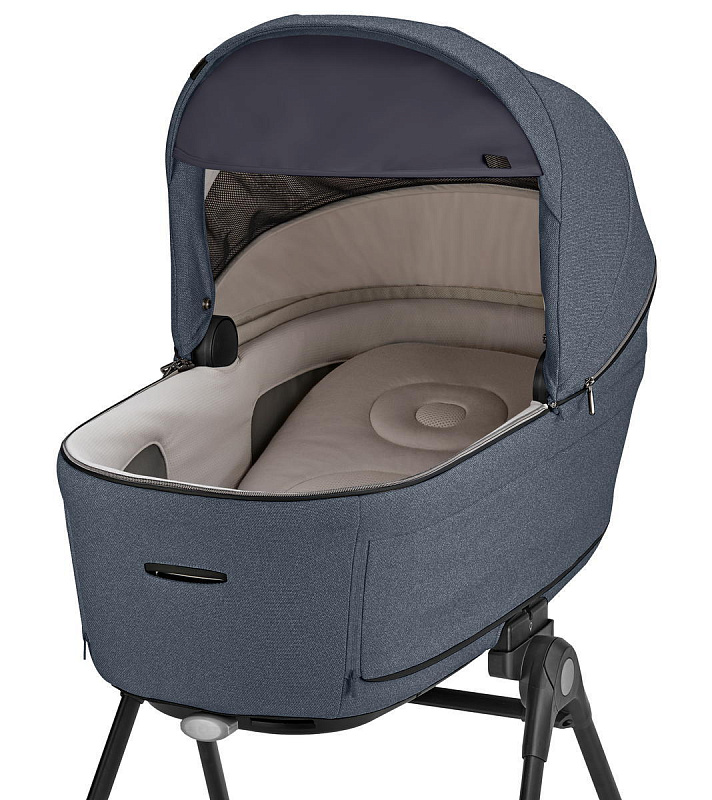 Регулируемый наклон основания люльки обеспечивает удобное положение новорожденному после кормления и позволяет наблюдать за окружающим миром во время бодрствования. Накидка на двух молниях обеспечивает оперативный доступ к малышу.