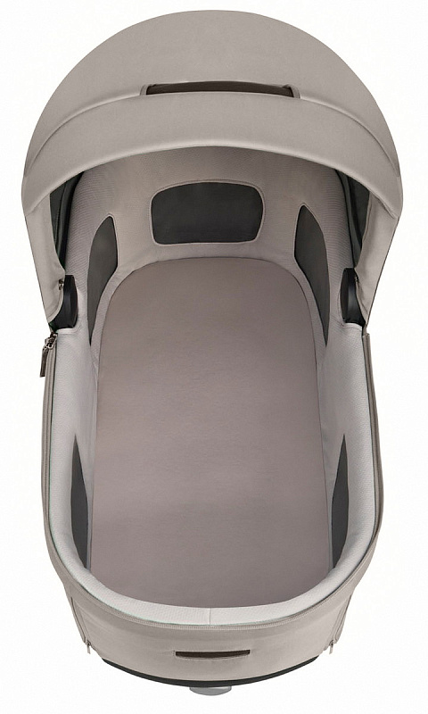 Наклон спинки регулируется: малыш может наблюдать за окружающим миром, когда не спит. Твердый каркас из полипропилена обеспечивает дополнительную защиту. Накидка на двух молниях для оперативного доступа к малышу. Система вентиляции дна люльки, вставка из «дышащей» сетки в капюшоне и в изголовье люльки позволяют регулировать приток воздуха и температуру внутри нее, а увеличенный капюшон с дополнительным козырьком защитит от ветра или солнца.
