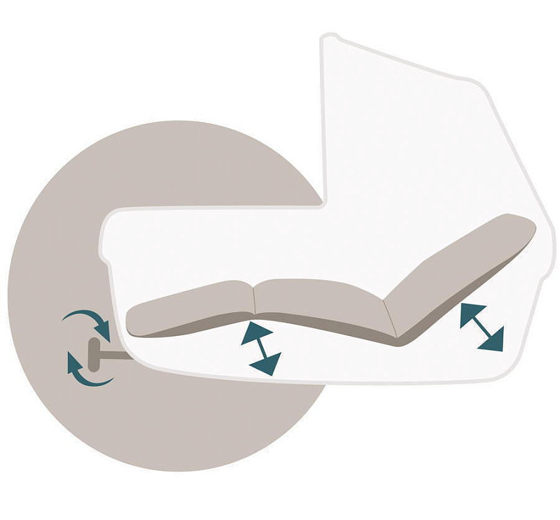Конструкция сиденья коляски изготовлена из гибкого материала, что гарантирует дополнительный комфорт с рождения до достижения ребенком веса 22 кг. Кроме того, спинка коляски откидывается в разных положениях в соответствии с положением ребенка. Для обеспечения комфорта предусмотрен выдвижной капюшон, который защищает сон ребенка от солнца и ветра.