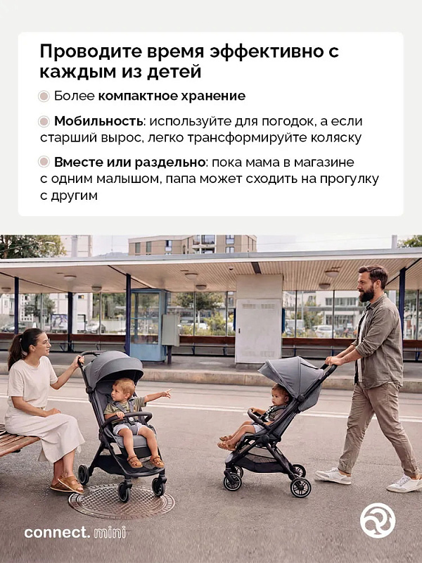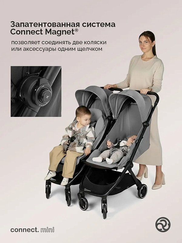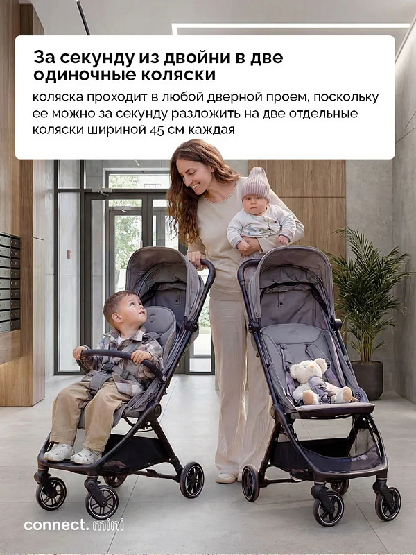 - Благодаря двойной конфигурации Connect Mini — коляска для двойни, которая проходит через любой дверной проем, поскольку ее можно за секунду разложить на две отдельные коляски шириной не более 45 см каждая;