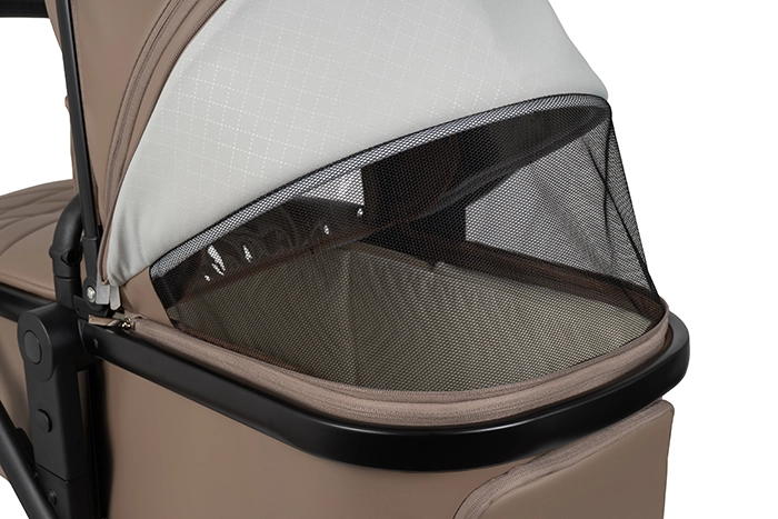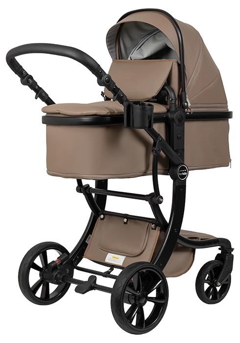 Коляска выполнена из экокожи Premium-класса с водоотталкивающей пропиткой, которая не только придает изделию изысканный вид, но и обеспечивает долговечность и простоту в уходе.