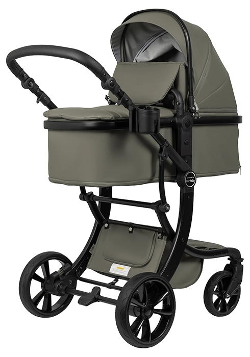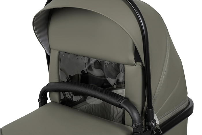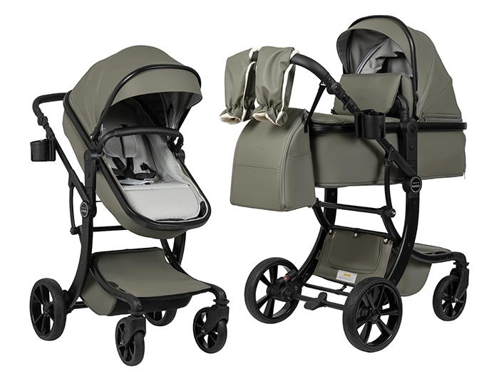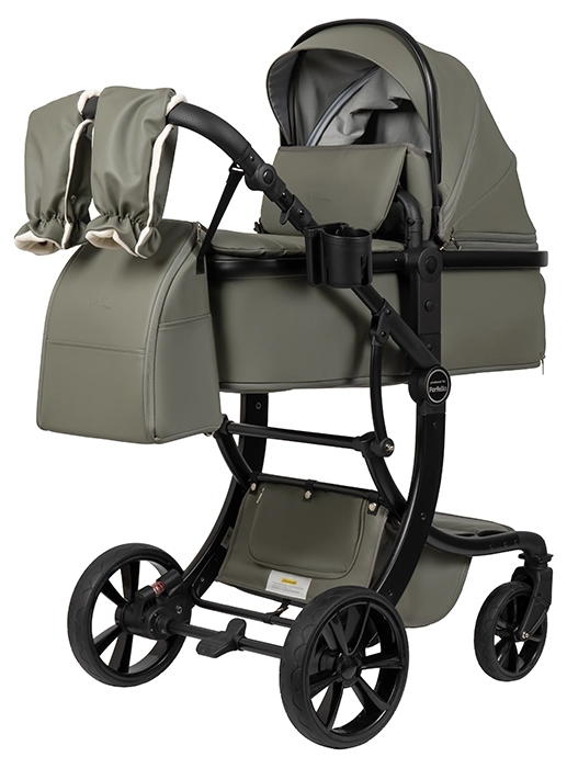 Коляска выполнена из экокожи Premium-класса с водоотталкивающей пропиткой, которая не только придает изделию изысканный вид, но и обеспечивает долговечность и простоту в уходе.