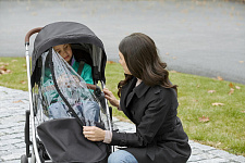 Большой капор с защитой от ультрафиолета UPF 50+. Капор оснащен дополнительной секцией на молнии, а смотровые окошки с москитными сетками позволяют наблюдать за ребенком во время прогулки и создают в коляске комфортный микроклимат.