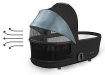 Люлька оснащена регулируемым солнцезащитным капором, который обеспечивает защиту от солнца на уровне UPF50+, и у которого имеется выдвижной козырёк, обеспечивающий дополнительную тень. Регулируемый капор с большим козырьком защищает ребёнка от солнца и ветра во время прогулки. У люльки имеется удобная ручка для переноса. Накидка для люльки надежно защищает малыша в ветреную и снежную погоду.