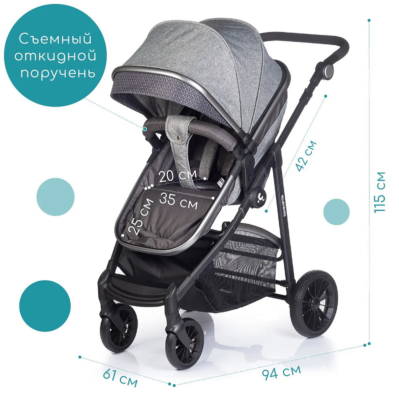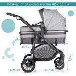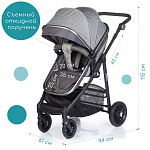Размер коляски в разложенном виде составляет 94х61х115 см (ДхШхВ), в сложенном виде — 95х61х42 см, размер спального места — 82х35 см, высота от пола до сиденья — 56 см, ширина сиденья — 35 см, длина сиденья — 20 см, высота спинки — 42 см, высота до ручки — 89–115 см, ширина передней оси — 34 см, ширина задней оси — 61 см, диаметр передних колёс — 17 см, диаметр задних колёс — 24 см, а вес составляет 10,2 кг.
