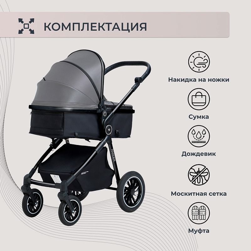 В комплекте: анатомический матрасик, сумка для мамы, дождевик, москитная сетка и муфта для рук.