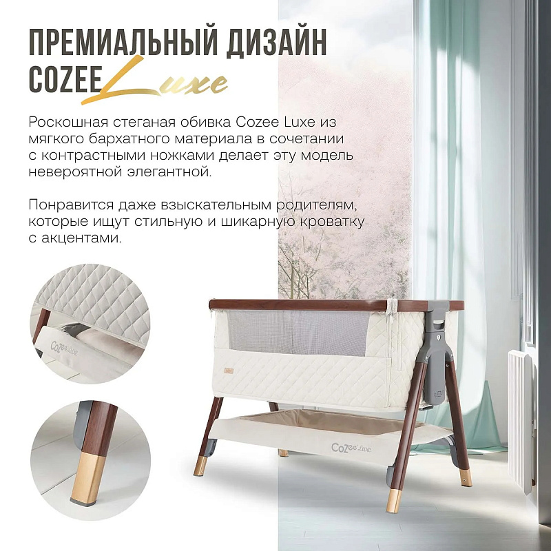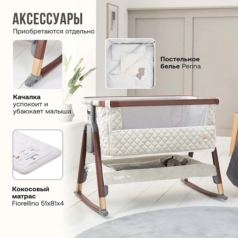 Дополните CoZee Luxe аксессуарами (приобретаются отдельно): качалка, комплекте постельного белья и простыней Perina, кокосовый матрас и наматрасник Fiorellino.