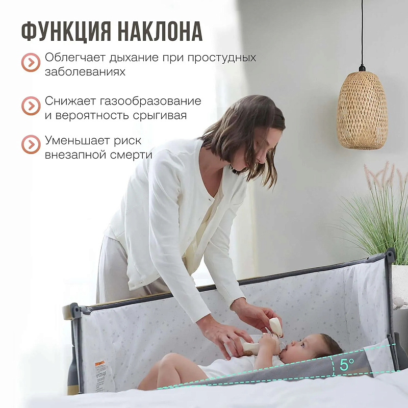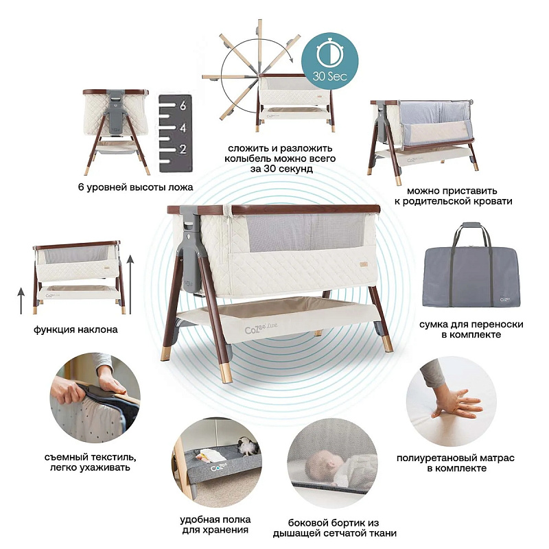 Чтобы отрегулировать угол наклона ложа колыбели CoZee, установите разные уровни высоты в изголовьях. А боковой бортик из дышащей сетчатой ткани позволит наблюдать за малышом, даже если вы находитесь на другом конце комнаты.