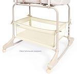 Для защиты спящего ребенка от яркого света имеется удобный складной капор. Внизу находится тканевая корзина, в которой можно хранить постельное белье. При помощи встроенных в полозья колес колыбель легко перемещается по квартире.