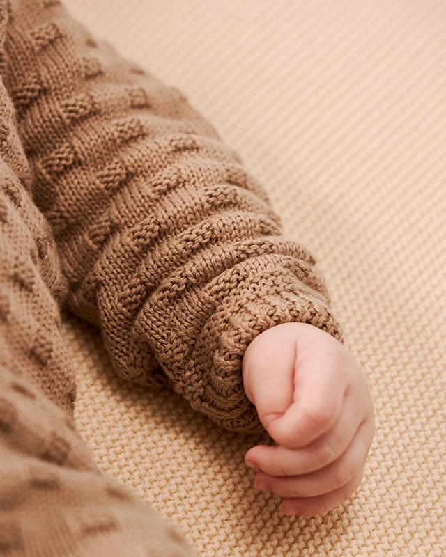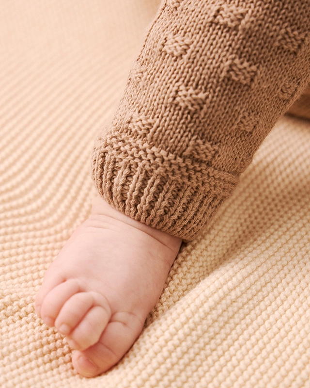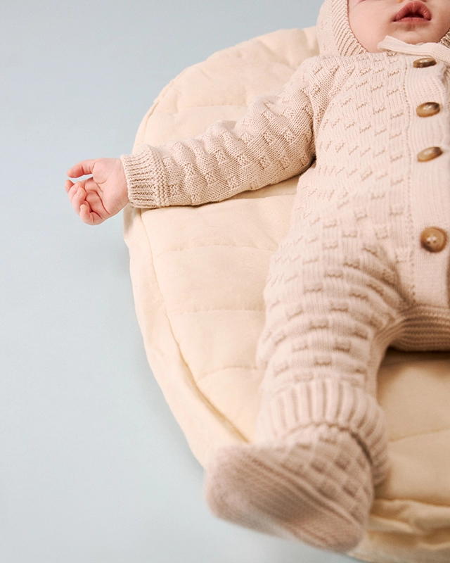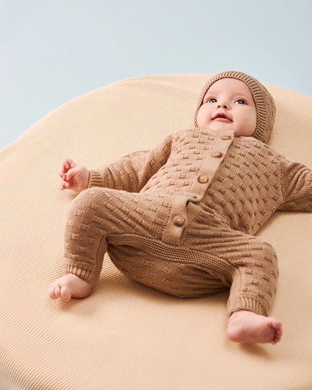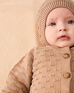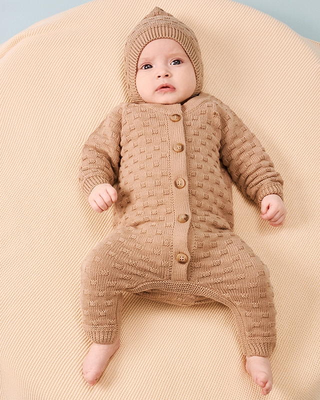 Вязаный комбинезон станет верным другом малыша с первых мгновений жизни. Пряжа из 100% хлопка обеспечивает комфортный теплообмен, заботится о чувствительной коже и стойко выдерживает частые стирки без катышков.