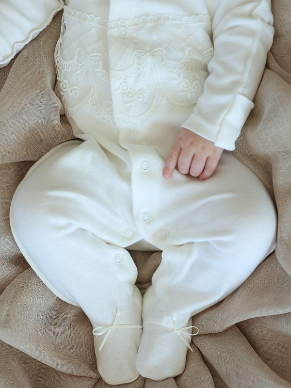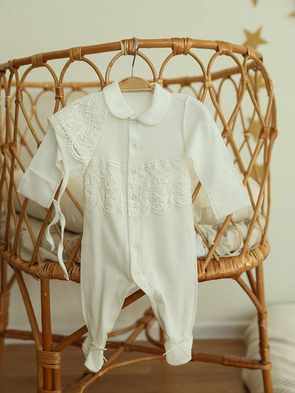 Кружевной набор для выписки малыша из роддома. Комбинезон выполнен из 100% хлопка, швами наружу и украшен кружевом. Чепчик однослойный с завязками, со швами наружу. Комплект смотрится невероятно нежно и станет украшением для Вашей выписки в любое время года. УХОД: рекомендована ручная или машинная стирка с использованием детского порошка, на деликатном режиме, при температуре воды не выше 40 градусов. Не отбеливать. Сушить вдали от обогревательных приборов и прямых солнечных лучей.