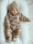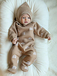 Комбинезон выполнен из ткани трикотаж футер 3х нитка с начесом - гладкий снаружи и теплый, мягкий внутри.