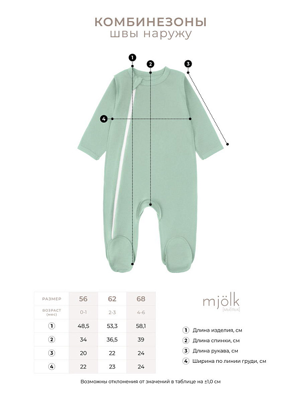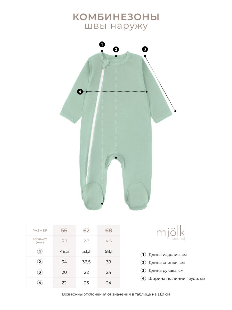 Комбинезон Mjolk — это детский нательный комбинезон на молнии с закрытой ножкой во всех размерах с 56 по 68, выполненный из плотного и очень мягкого трикотажа. Он станет отличным комбинезоном для новорождённых и на выписку. Все швы на изделии выполнены снаружи.