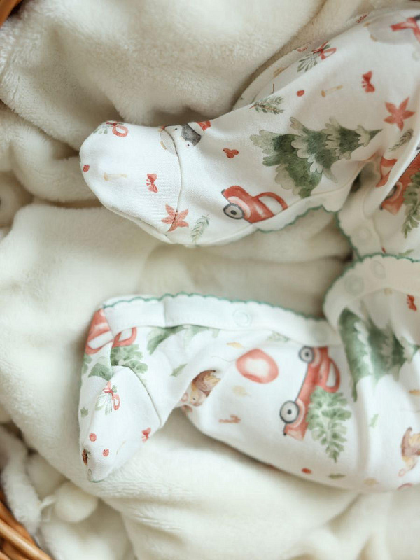 Комбинезон из нежного трикотажа на кнопках с принтом. Удобная модель, позволит легко и быстро переодевать малыша. Кнопки расположены по центру, сверху донизу. Также, для удобства смены подгузника, мы предусмотрели кнопочки и между ножек в размерах 56-74.