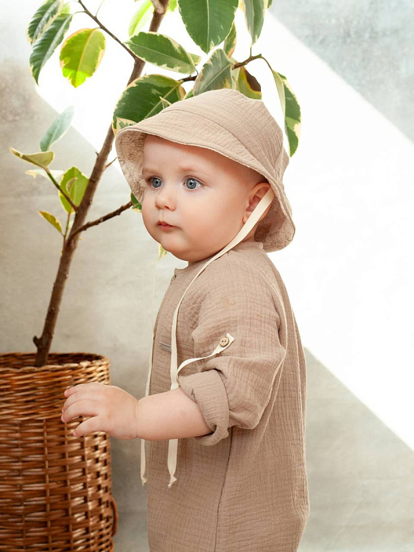 Стильный комбинезон из органического муслина. Идеальный вариант для летних прогулок для малышей с рождения. Благодаря уникальным свойствам органического муслина такой комбинезон не даст нежной, чувствительной, детской коже перегреться. А свободный крой будет дарить только чувство комфорта. С помощью подворотов на рукавах и штанишках такой комбинезон одним движением руки можно «превратить» в стильный песочник.