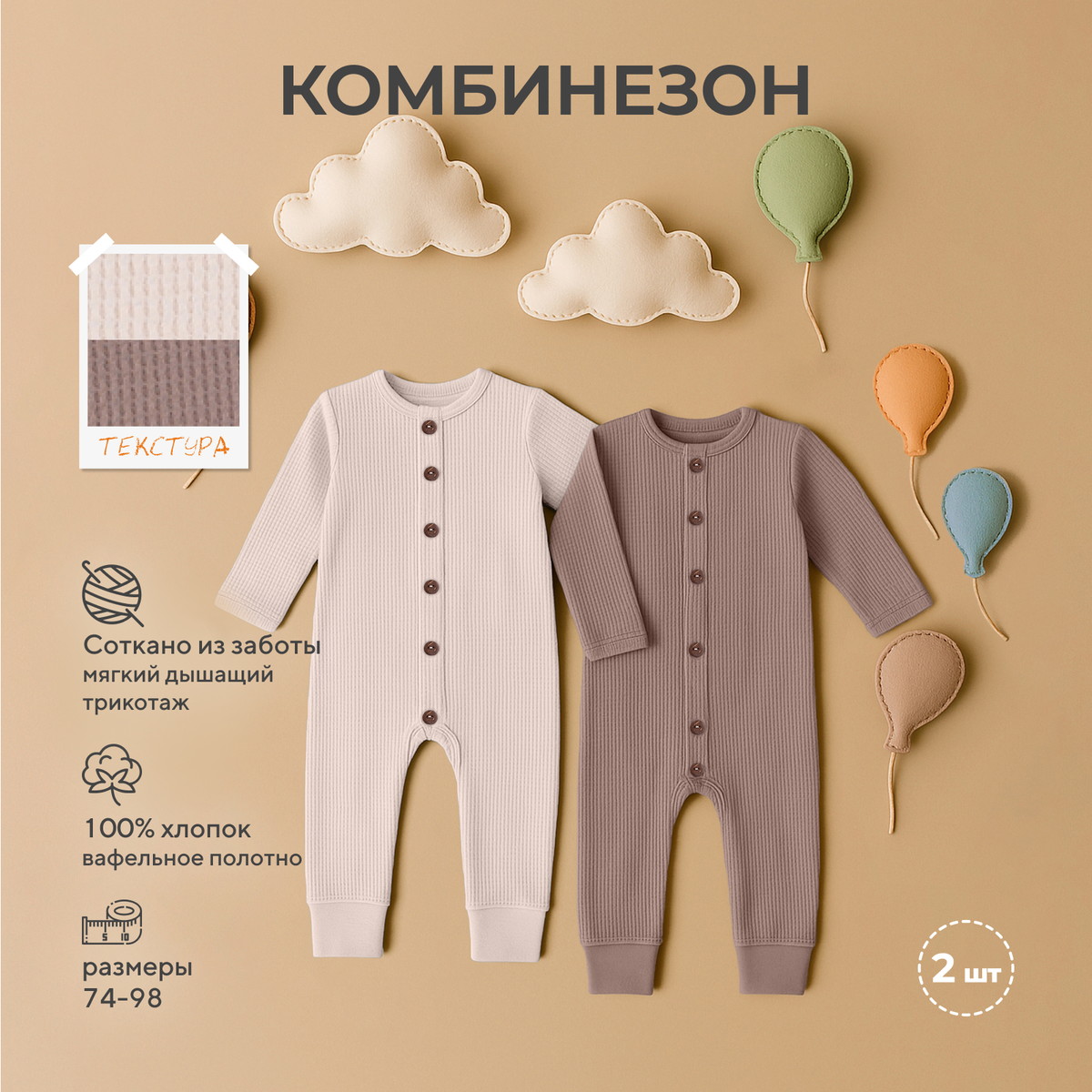 Каждый образ, созданный с помощью коллекции, хочется потрогать взглядом. И неудивительно, ведь особая магия моделей WAFFY это: деликатные спокойные расцветки (мятный, небесно-голубой, кофе с молоком, миндальный, крем-брюле), натуральные премиальные ткани (фактурный вафельный трикотаж - тактильно приятный материал, прекрасно впитывающий влагу, но пропускающий воздух), качественная фурнитура, комфортное лекало, лаконичное исполнение, сочетающиеся между собой изделия.