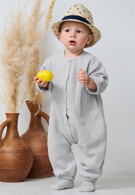 - Комбинезон создан из воздушного муслина (100% хлопок) – это мягкий и нежный материал, который хорошо пропускает воздух, позволяя коже ребенка дышать.