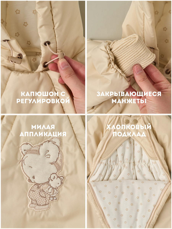 Размеры: доступны для детей от 0–3 месяцев (рост 62 см) до 6–9 месяцев (рост 74 см). Уточняйте подходящий размер в размерной сетке.