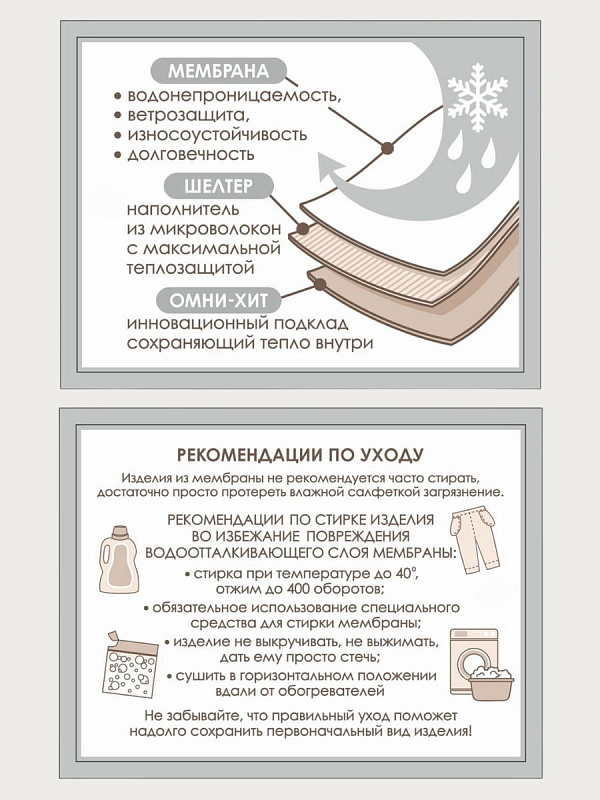 Мембранная ткань защищает от ветра и влаги, сохраняя тепло внутри комбинезона.