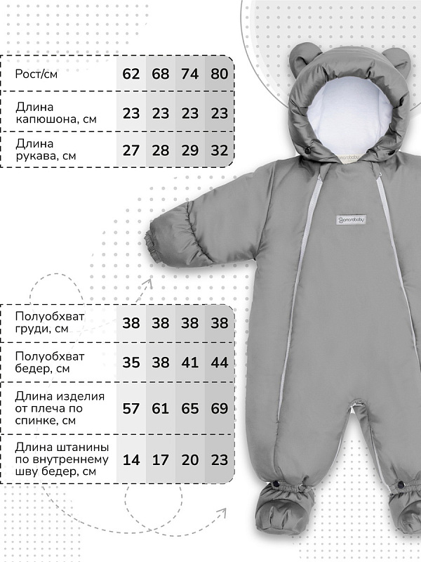 - За изделием легко ухаживать: можно стирать в машинке комбинезон или отдельно подкладку на бережном режиме при температуре не более 30 °С, небольшие загрязнения легко удаляются влажной тряпкой.