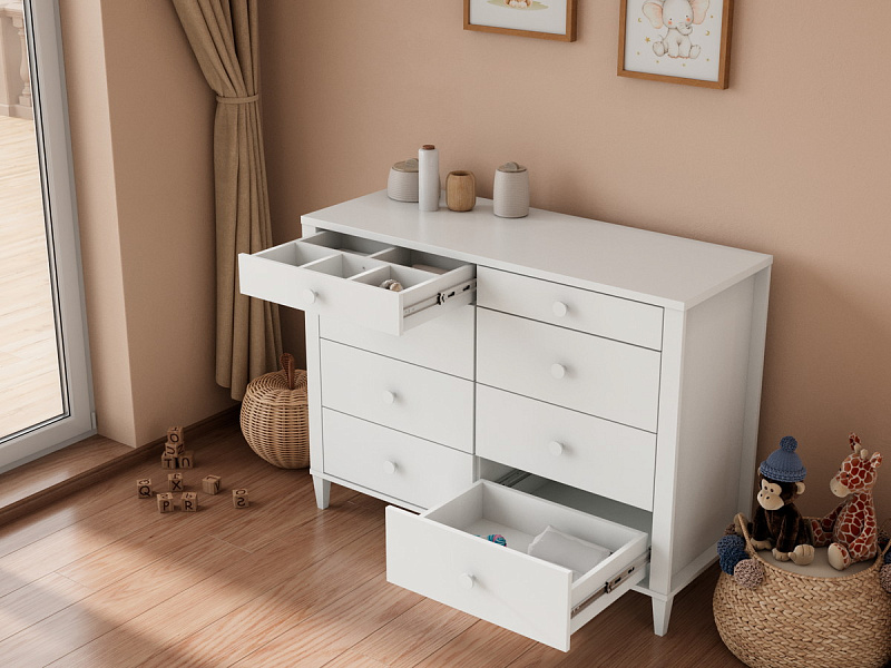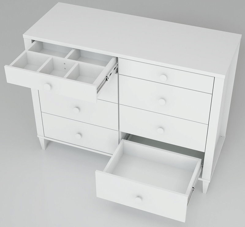 Все восемь ящиков комода, словно по волшебству, двигаются бесшумно и плавно благодаря доводчикам, обеспечивая не только плотное прилегание, но и надежную защиту от пыли.