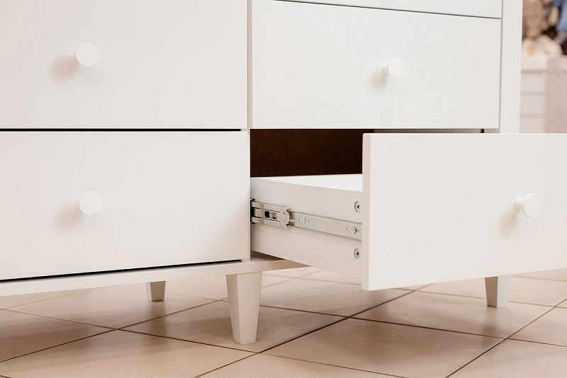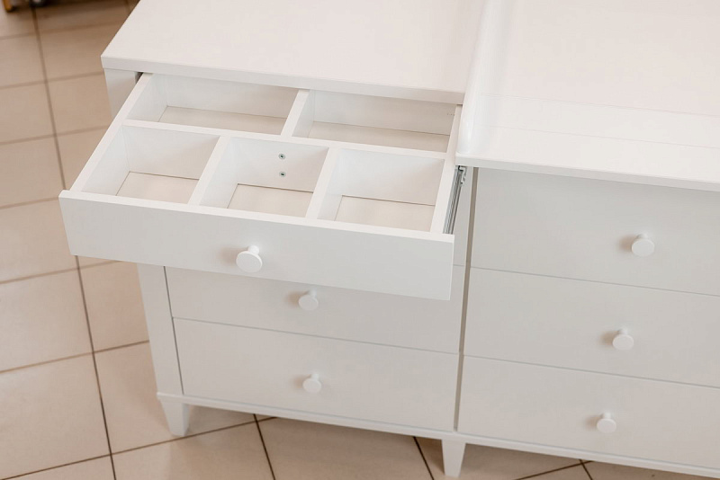 Все восемь ящиков комода, словно по волшебству, двигаются бесшумно и плавно благодаря доводчикам, обеспечивая не только плотное прилегание, но и надежную защиту от пыли.