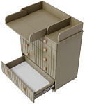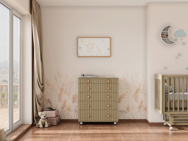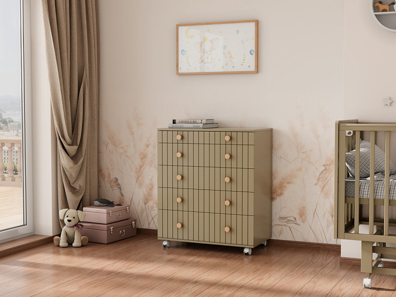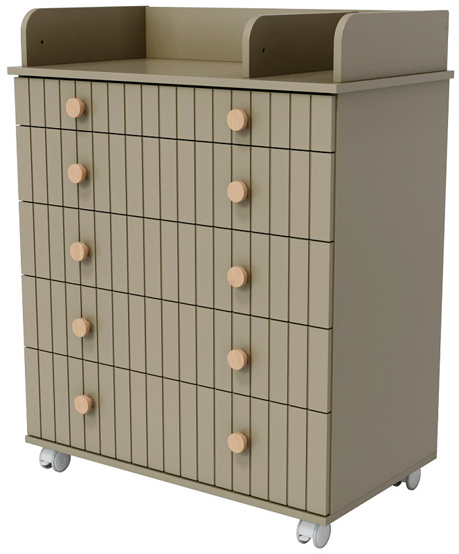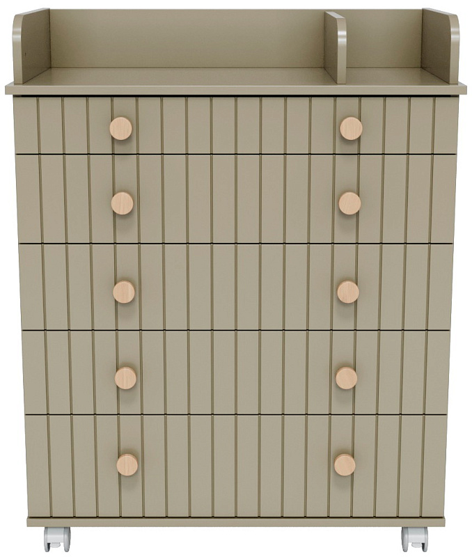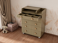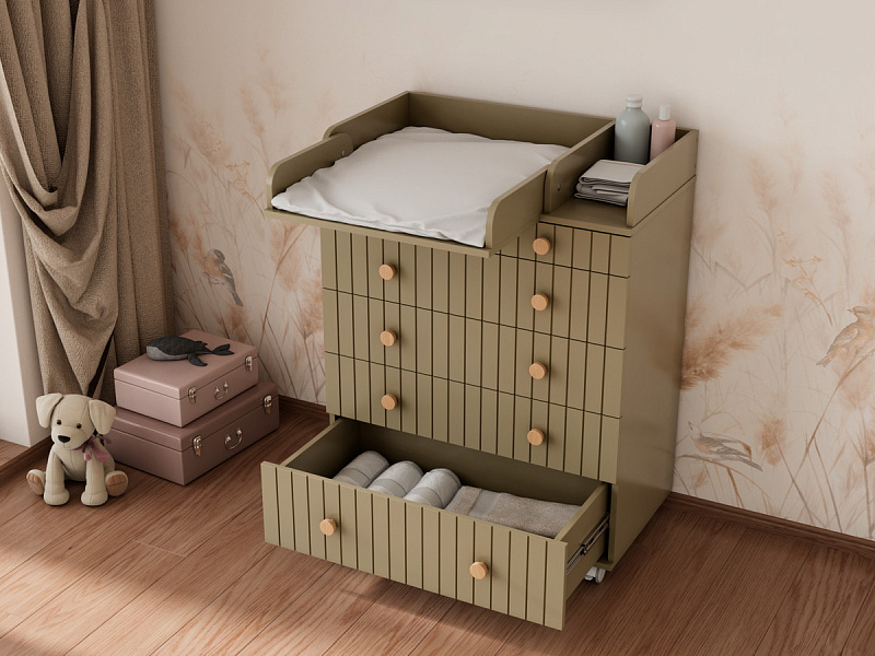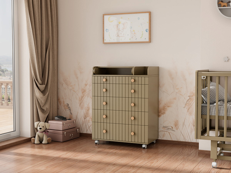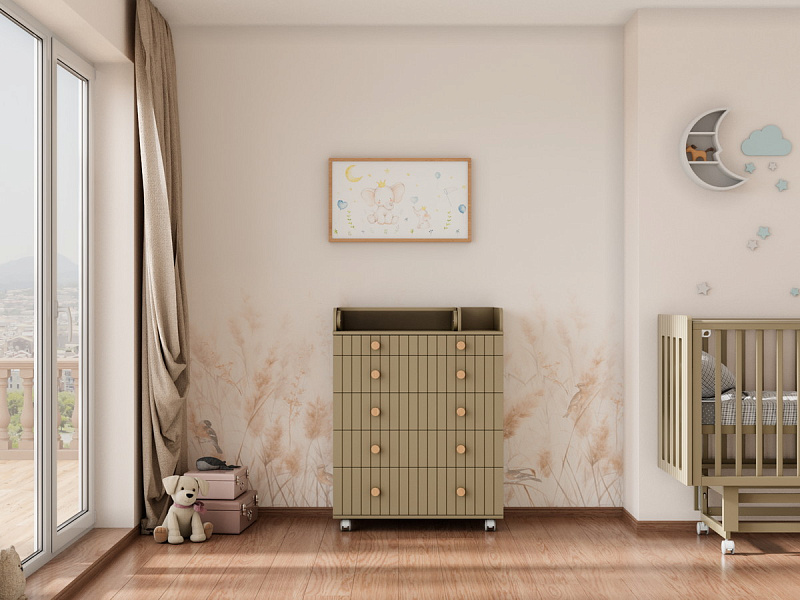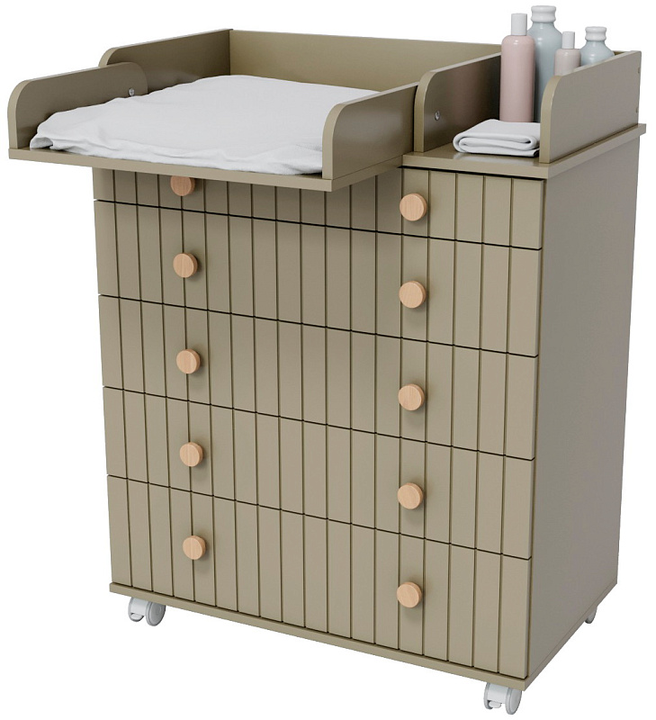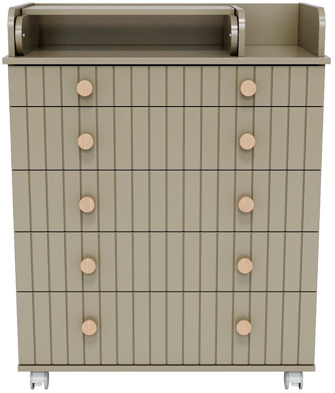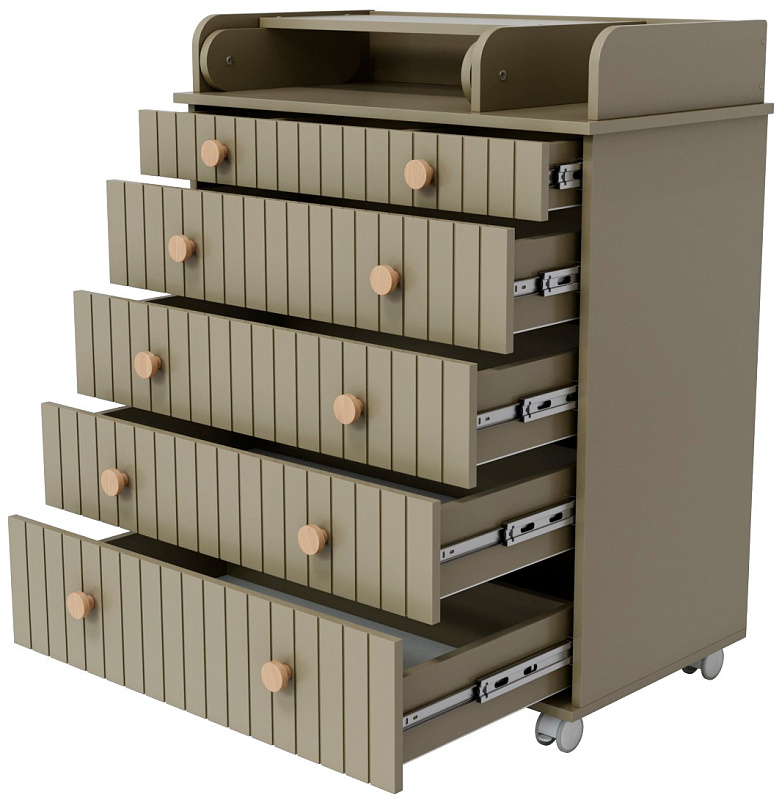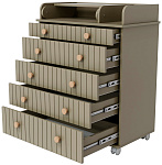 Комод "Charm" с пятью ящиками – воплощение функциональности и уюта. Верхний ящик оснащен органайзером, обеспечивающим идеальный порядок. Откидной пеленатор превращает комод в удобное место для ухода за малышом. Легкое перемещение комода обеспечивают колесики. Изготовленный из МДФ и ЛДСП, он сочетает в себе прочность и эстетичный внешний вид. Шариковые направляющие ящиков гарантируют плавное и бесшумное скольжение.