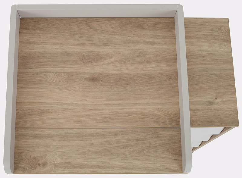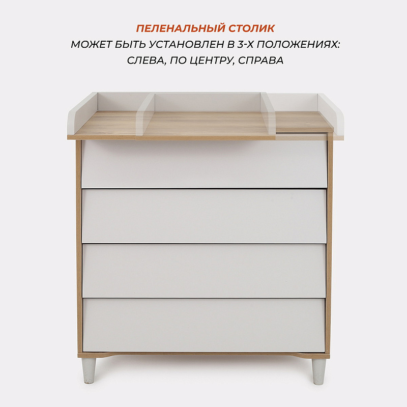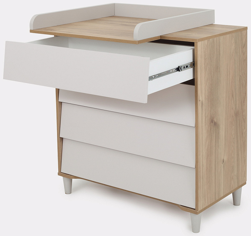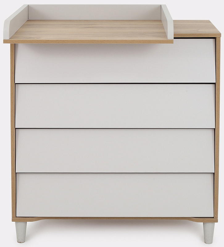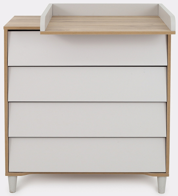 комод дополнен откидным бортиком, превращающим его в полноценный пеленальный столик. Когда малыш подрастёт, бортик можно будет снять.