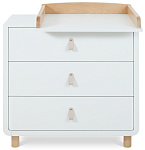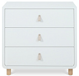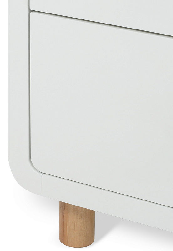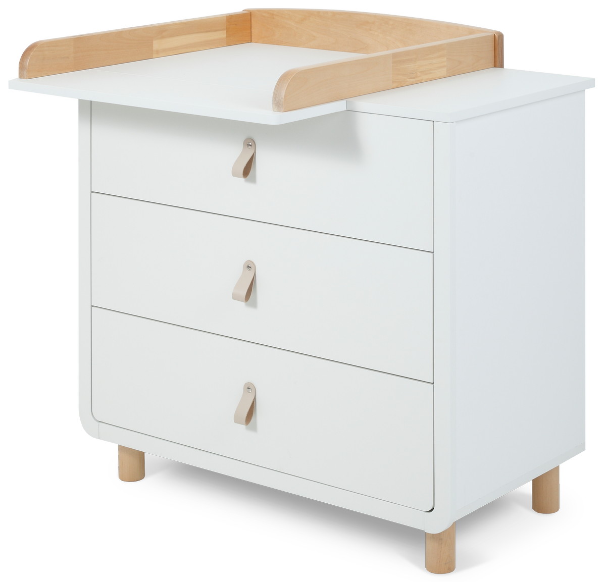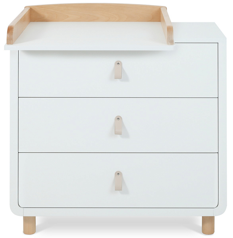 плавные линии бортика не только рифмуются с обтекаемым фасадом комода и ножками в форме цилиндров, но и обеспечивают безопасность (старший ребенок не наткнется на острый угол пеленальной накладки)