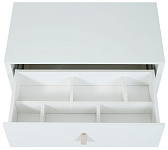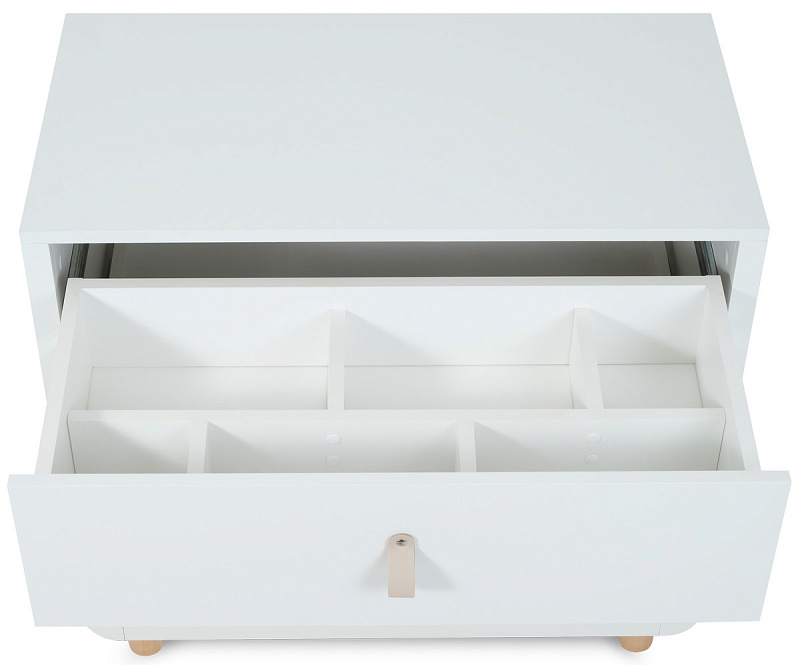 верхний ящик комода поделен на 6 разноформатных секций, куда так удобно сложить все необходимые вещи для ухода за младенцем (подгузники, одноразовые пеленки, детскую косметику для тела)