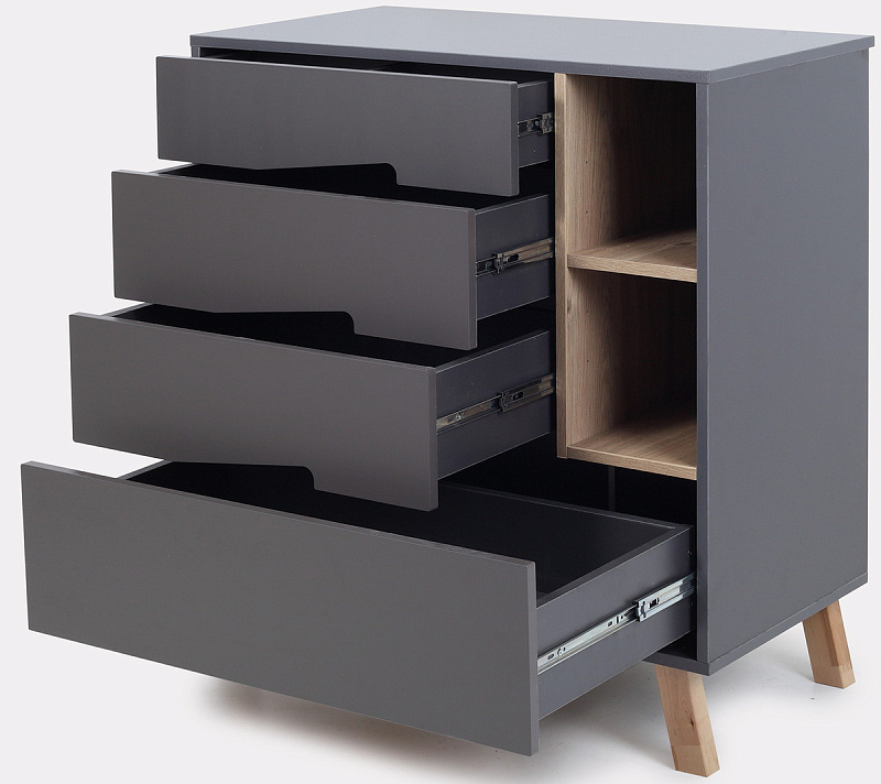 к тому же ящики дополнены телескопическими направляющими, благодаря которым комод способен выдерживать большие нагрузки на протяжении длительного времени