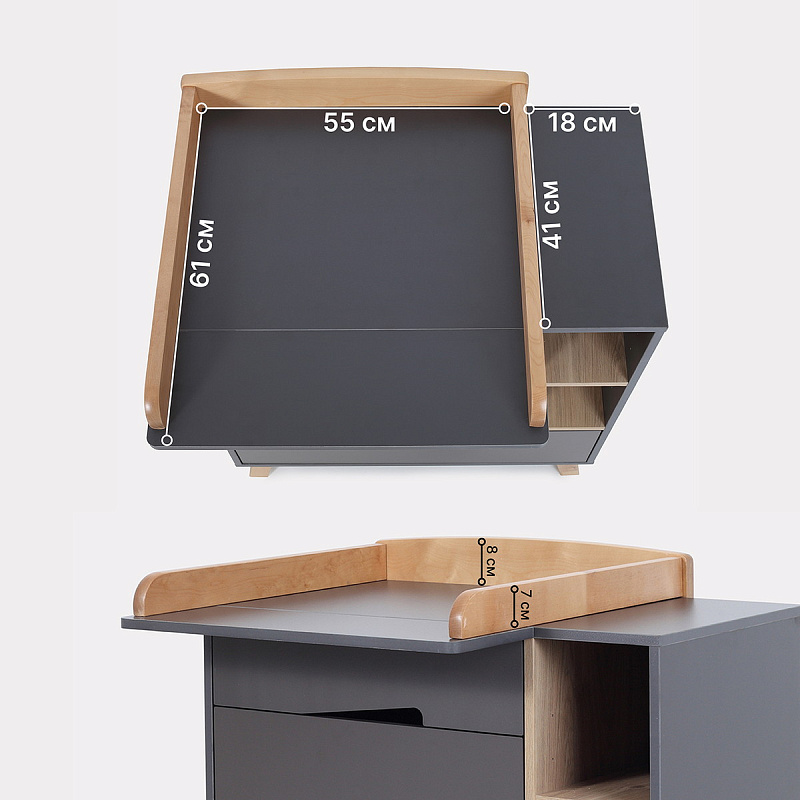 комод дополнен бортиком, превращающим его в полноценный пеленальный столик. Бортик с безопасно закругленными краями можно установить в двух положениях - слева и справа.
