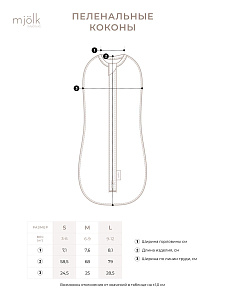 Кокон Mjölk изготовлен швами наружу, молния нашита сверху ткани так, чтобы не соприкасаться с кожей, а у шеи дополнительно защищена трикотажным языком. Пелёнку-кокон на молнии легко надеть, а наличие двух замков позволяет удобно сменить подгузник. В коконе ребёнок будет спокойно спать без возможности распеленаться и разбудить себя.