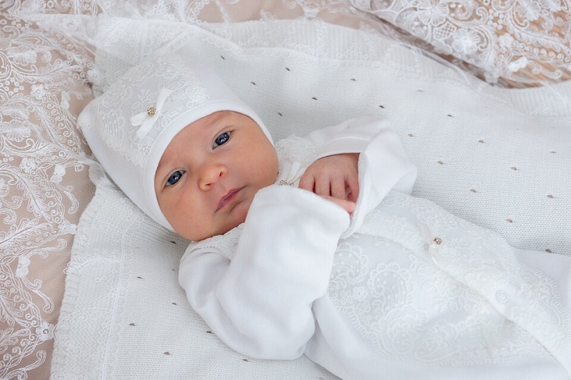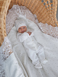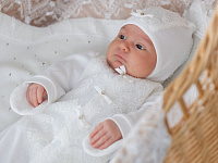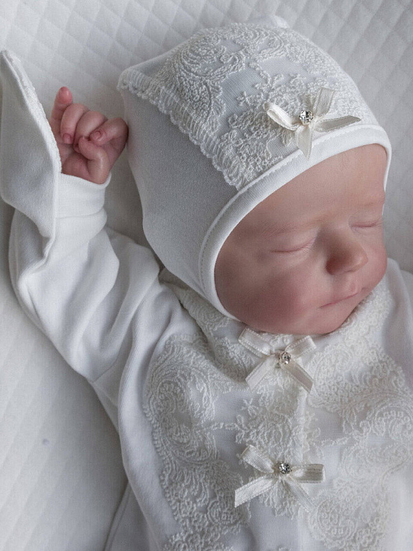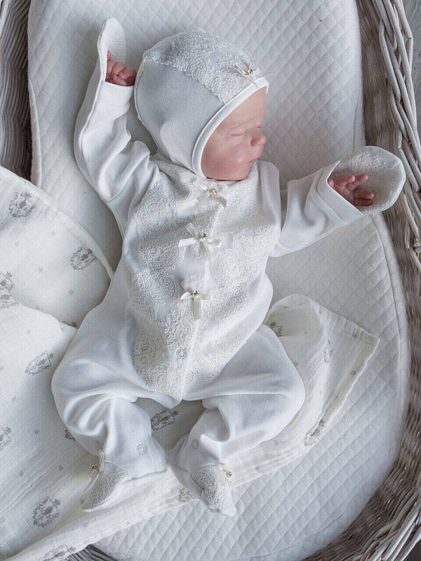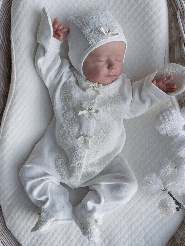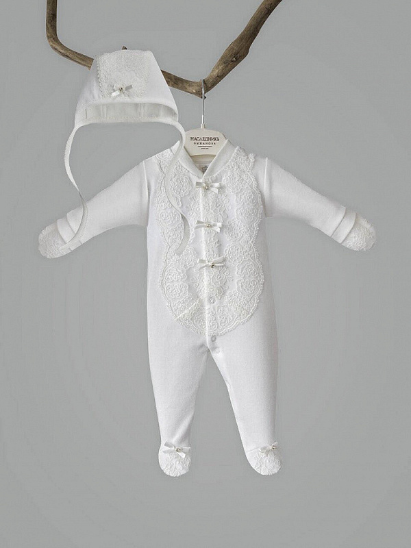 Комплект на выписку выполнен из хлопка высочайшего качества. Комбинезон свободного кроя, застегивается от воротничка до ножек на застежки-кнопки. Манжеты рукавов сшиты вместе с антицарапками. Спереди украшен необыкновенно красивым кружевом и изящным атласным бантиком со стразами.