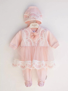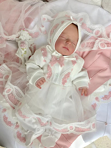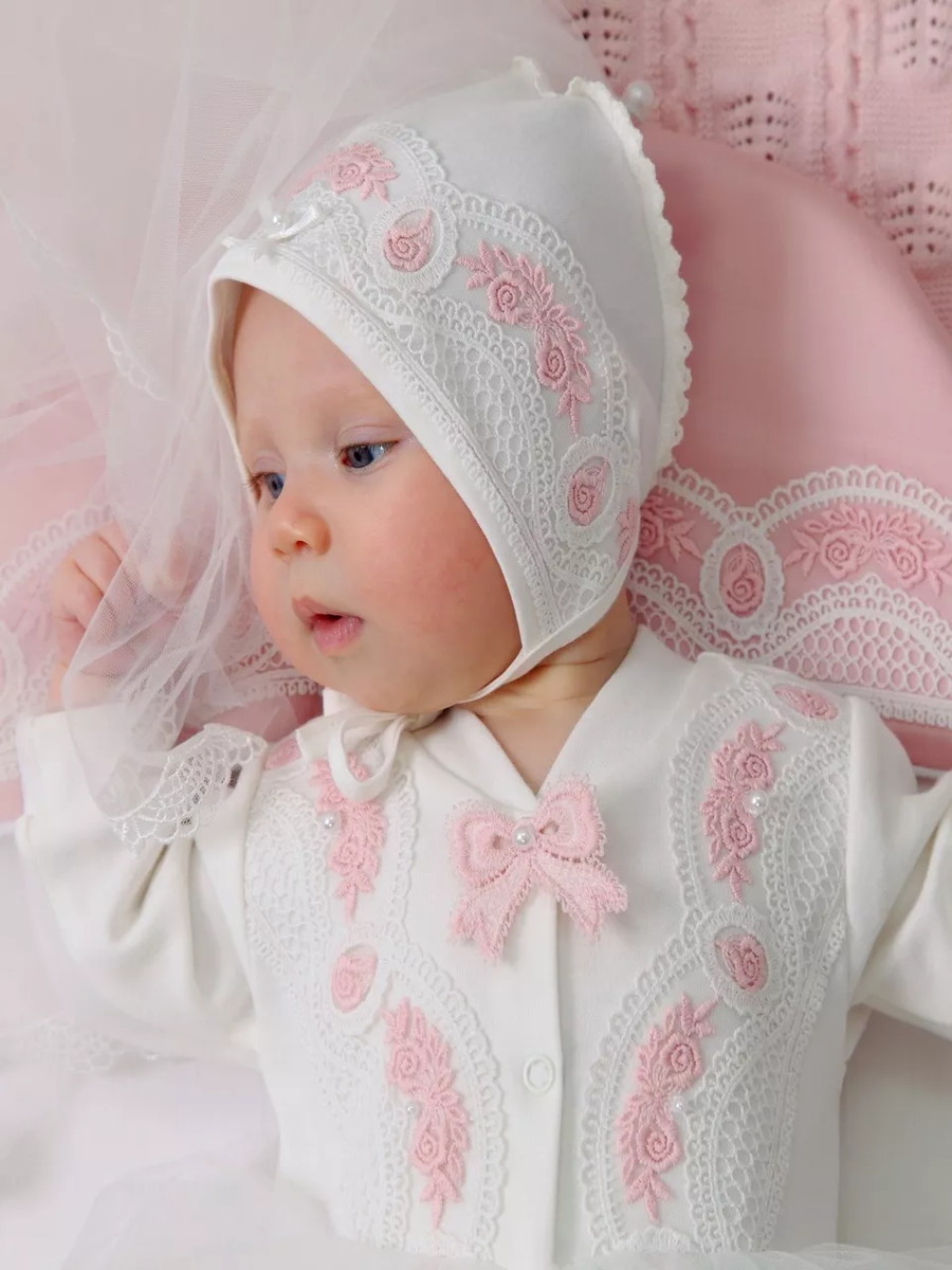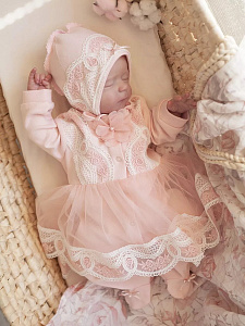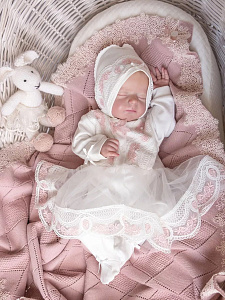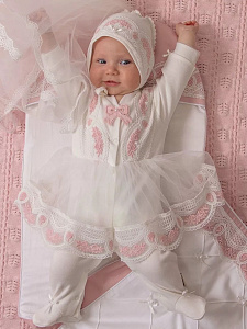 Изящный комплект на выписку. Сшит из нежнейшего натурального хлопка. Украшен тончайшим кружевом с нежно-розовой вышивкой. Декорирован пышной кружевной юбочкой, которая придает образу невероятный шарм.
