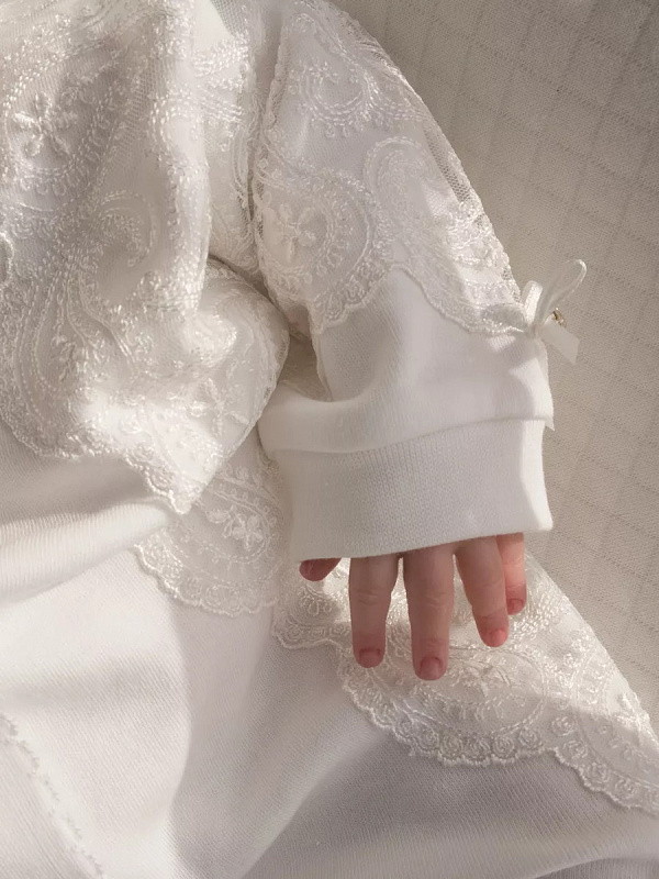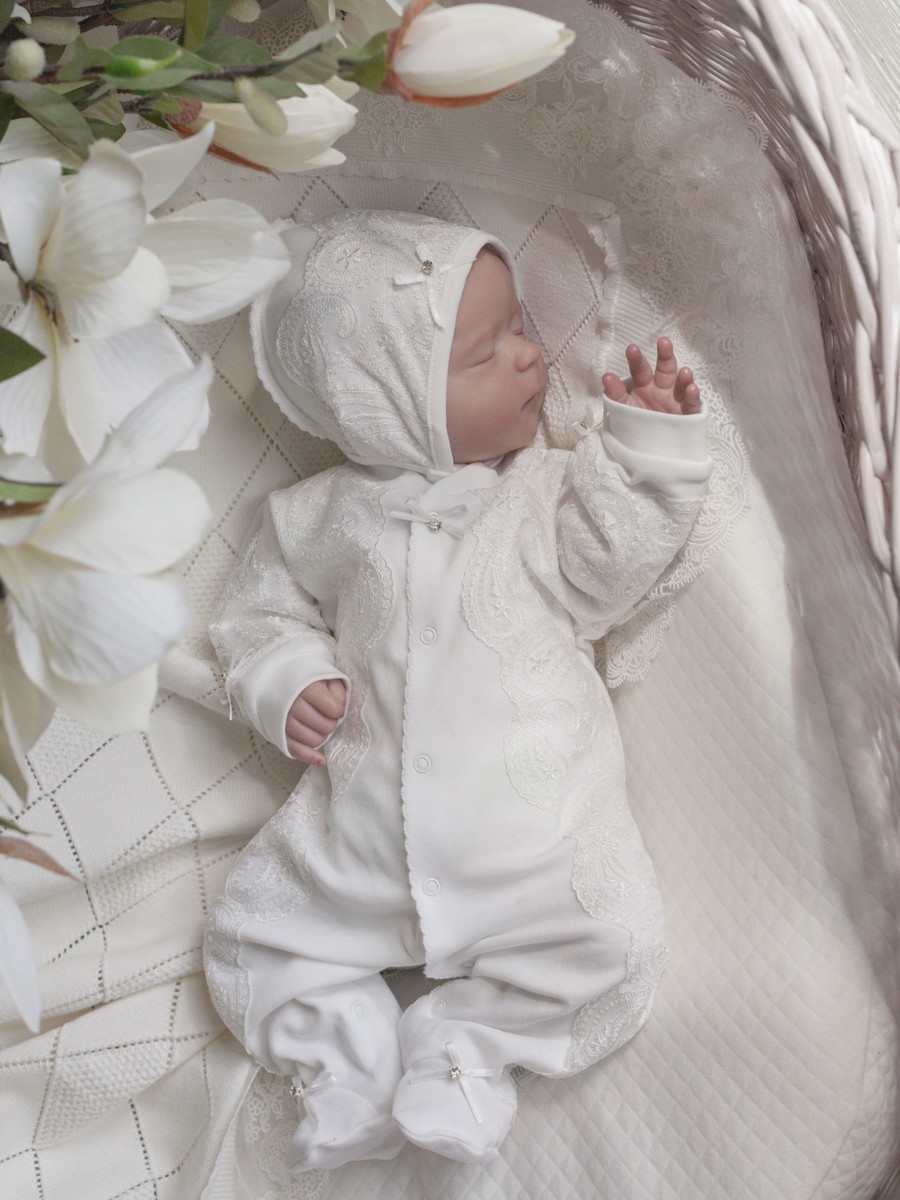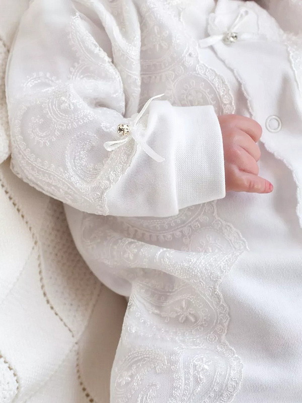 Нежный комплект на выписку представлен в двух цветах: розовом и экрю. Выполнен из хлопка высочайшего качества. Комбинезон застегивается от воротничка до ножек на удобные застежки-кнопки. Комплект украшен нежнейшим кружевом и изящными атласными бантиками со стразами.