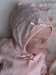 Нежный комплект на выписку представлен в двух цветах: розовом и экрю. Выполнен из хлопка высочайшего качества. Комбинезон застегивается от воротничка до ножек на удобные застежки-кнопки. Комплект украшен нежнейшим кружевом и изящными атласными бантиками со стразами.