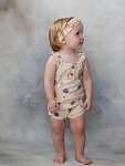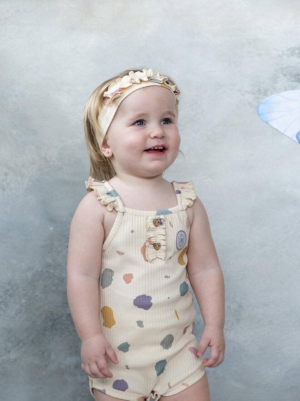 Летний комплект для девочки состоит их песочника и повязки на голову. Модель не имеет застежек, что позволит быстро снять и одеть песочник.
