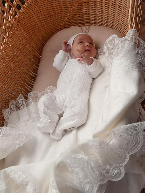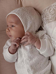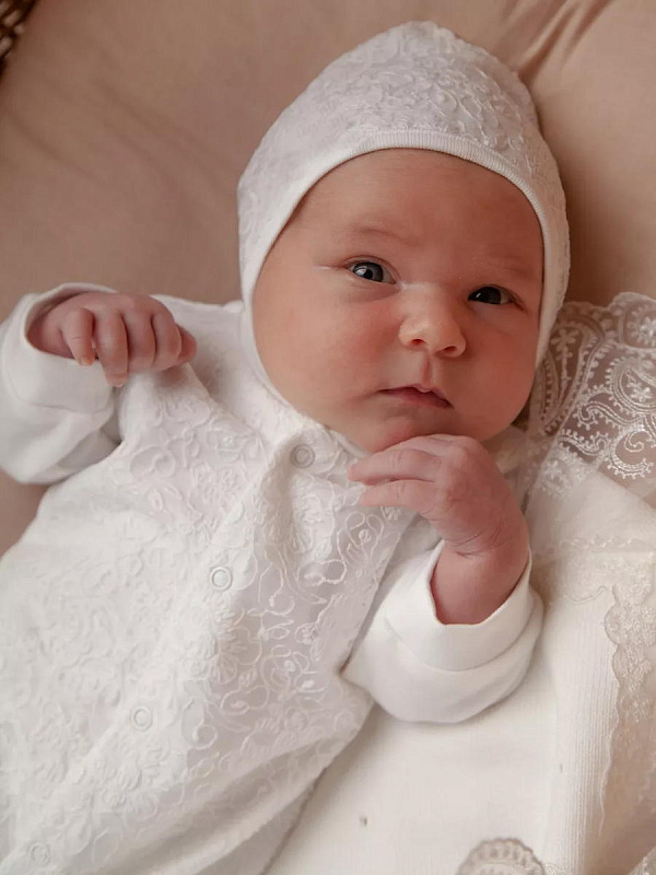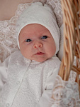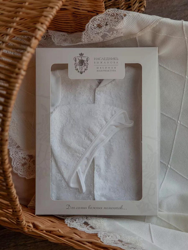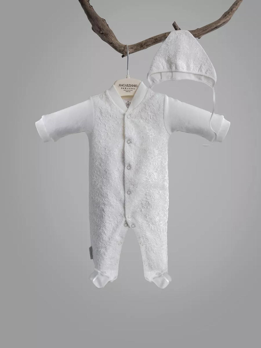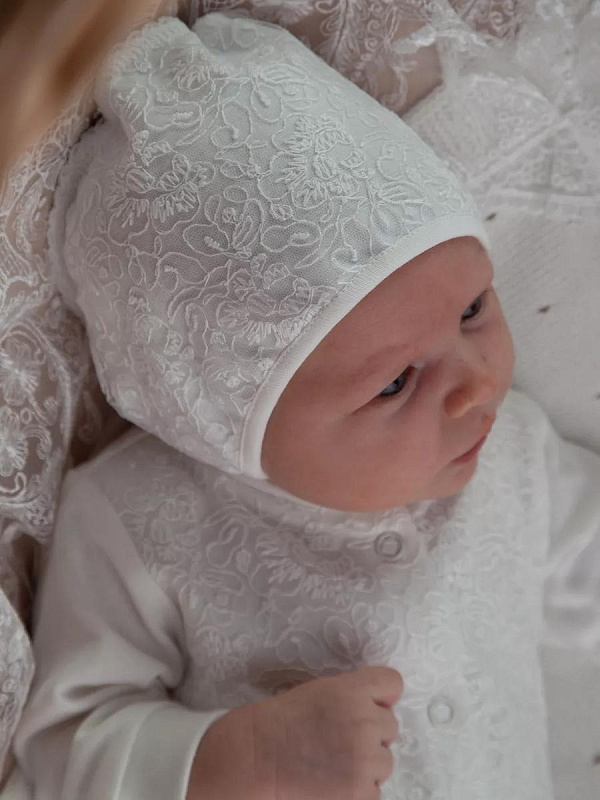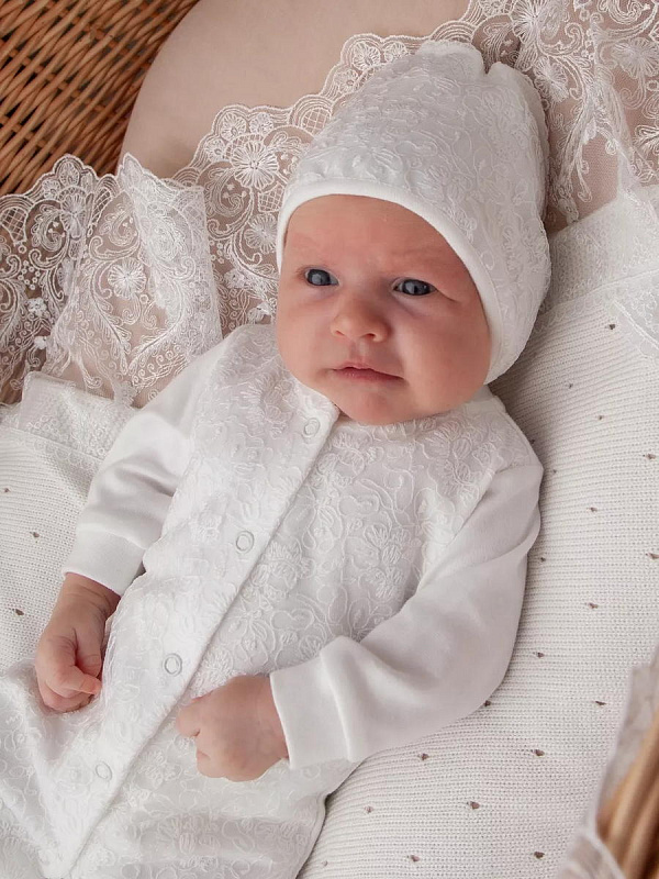 Отделка выполнена из нежнейшего кружева. Состав комплекта: комбинезон на кнопках, чепчик, фирменная коробка.