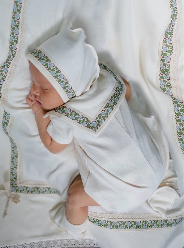 Комплект не только на крещение малыша, но и торжественную выписку из роддома, а также для летних пронулок. Натуральный органический хлопок создает атмосферу комфорта , а дизайнерское решение в отделке, делают комплект уникальным стильным современным. Комплект для мальчика: комбинезон (песочник), чепчик, пинетки.