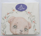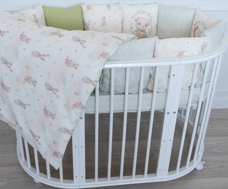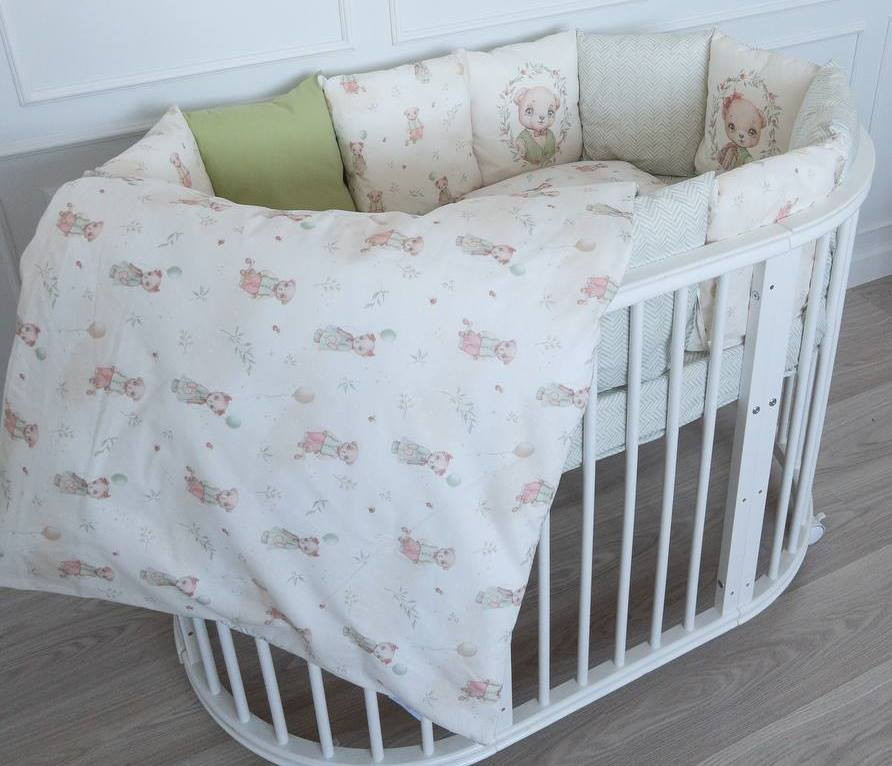 Комплект 3 предмета "Винтаж" арт.3120 для круглой (овальной) кроватки, выполнен в бежевой и оливковых тонах с изображением милых зверят медвежонка и котенка