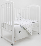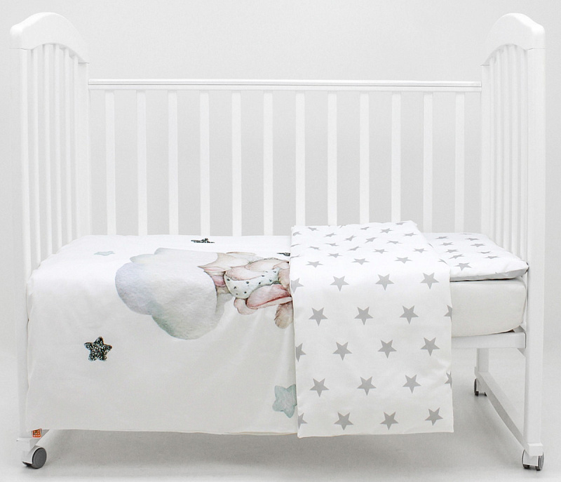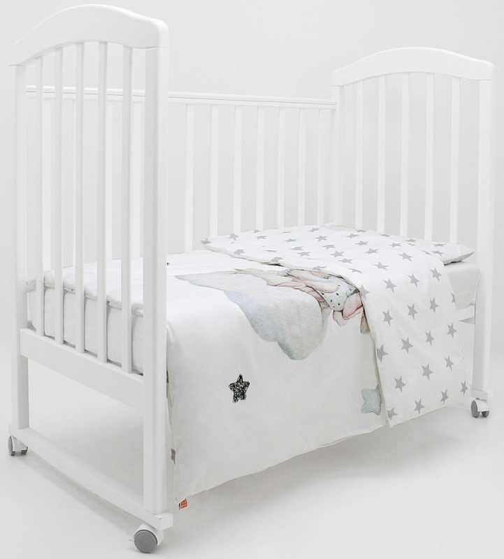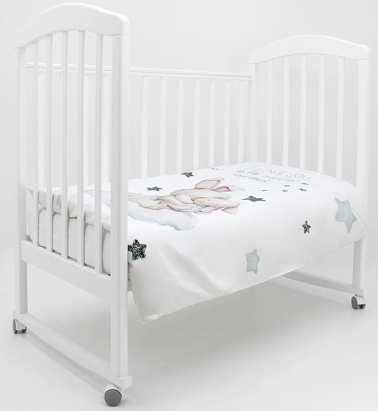 потрясающе-нежный комплект. Пододеяльник украшает милый дизайнерский принт в виде зайчат - мамы и малыша, трогательная надпись “I love you to the moon and back” и россыпь звездочек.